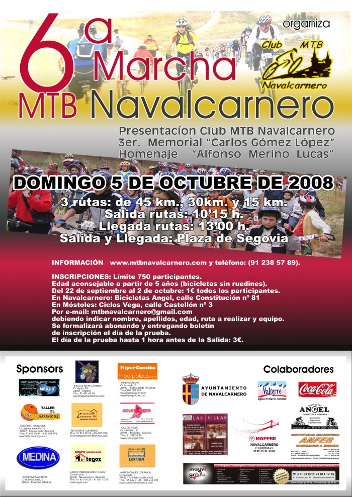 El próximo domingo 5 de octubre tendrá lugar la 6ª Marcha Mountain Bike Navalcarnero. Además, se realizarán el 3er. Memorial “Carlos Gómez López” y el…